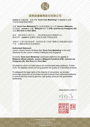 Currently, "Aone Care Marketing" authorized platforms are nywow o Malaysia official website, nywow o - Malaysia Facebook (FB), nywowo.my Instagram (IG), Elle Onni and Onni Mart.